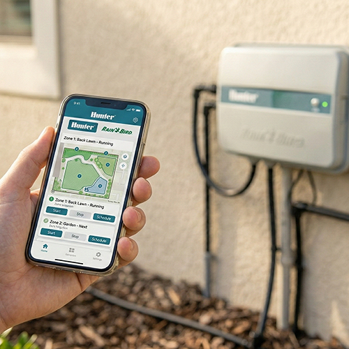 We install the latest WiFi and Bluetooth-enabled controllers from Hunter and Rain Bird, allowing you to manage your system from your phone and adjust automatically based on local weather.